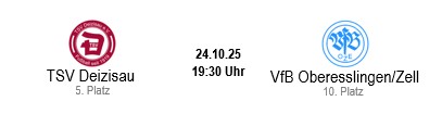 Am kommenden Freitag um 19:30 Uhr trifft der TSV Deizisau auf den VfB Oberesslingen/Zell. Am letzten Spieltag nahm der TSV Deizisau gegen den TV Nellingen die vierte Niederlage in dieser Spielzeit hin. Das letzte Ligaspiel endete für den VfB Oberesslingen/Zell mit einem Teilerfolg. 0:0 hieß es am Ende gegen FV Neuhausen II.